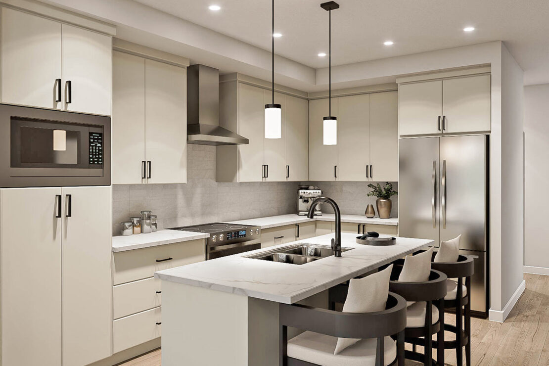 - 1¼” quartz countertops in kitchen, main bath and ensuite