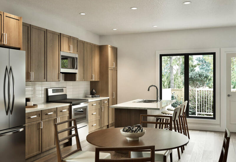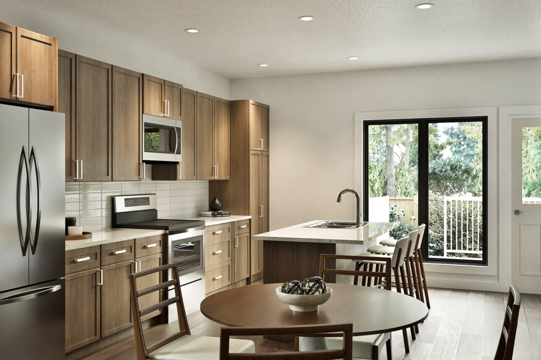 - 1¼” quartz countertops in kitchen, main bath and ensuite