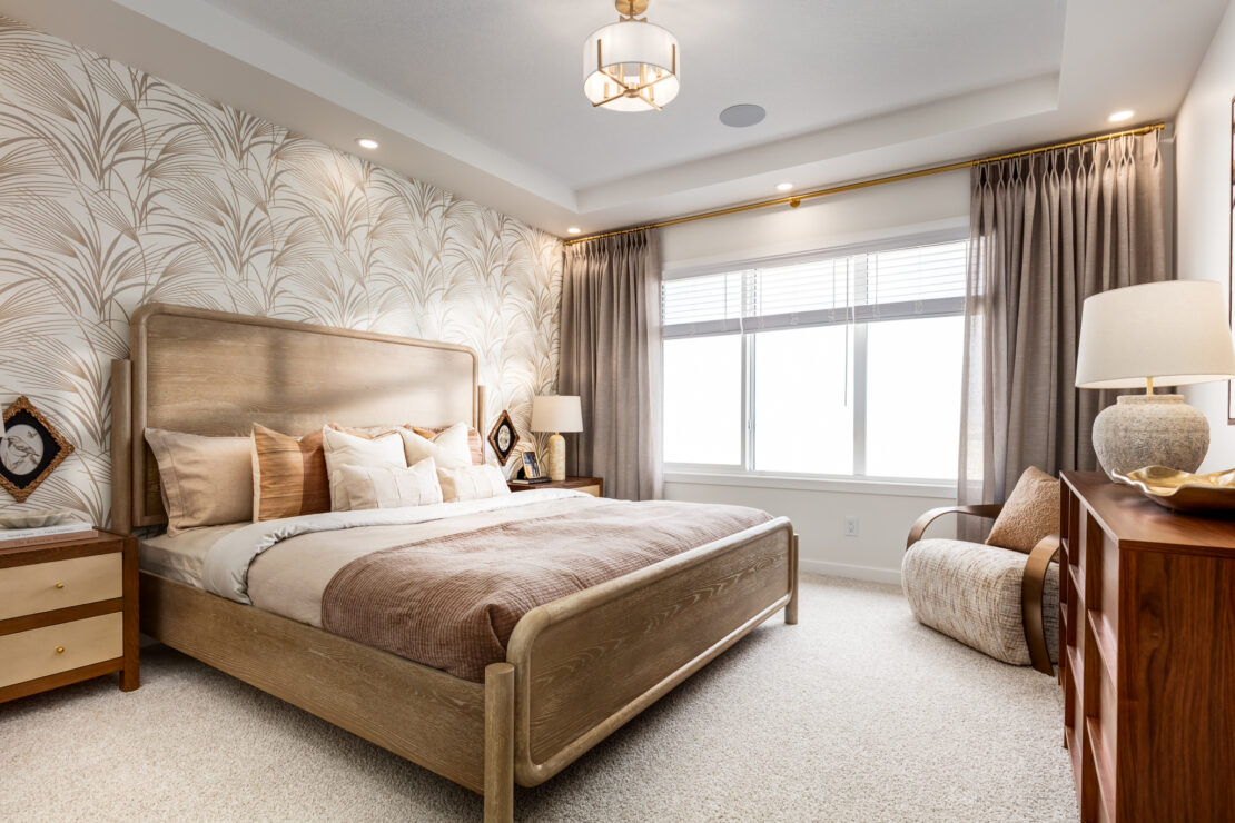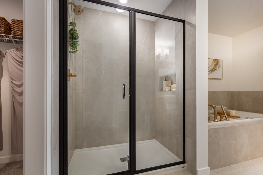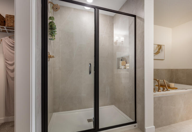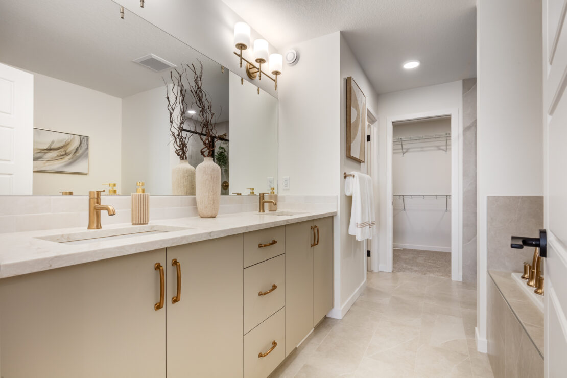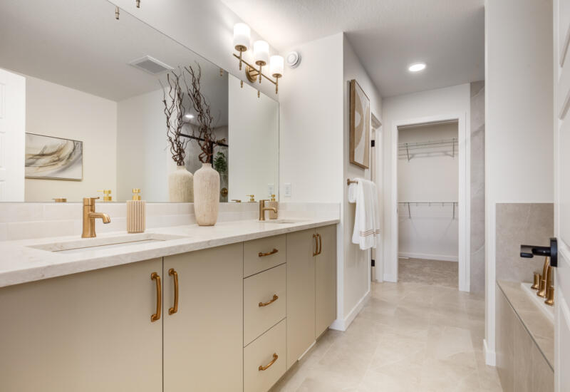 - Ensuite includes large one-piece soaker tub with ceramic tile, dual sink vanity and separate shower unit (plan-specific)