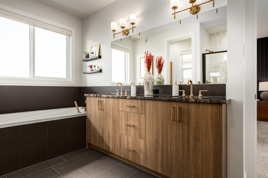 - Ensuite includes large one-piece soaker tub with ceramic tile, dual sink vanity and separate shower unit (plan-specific)