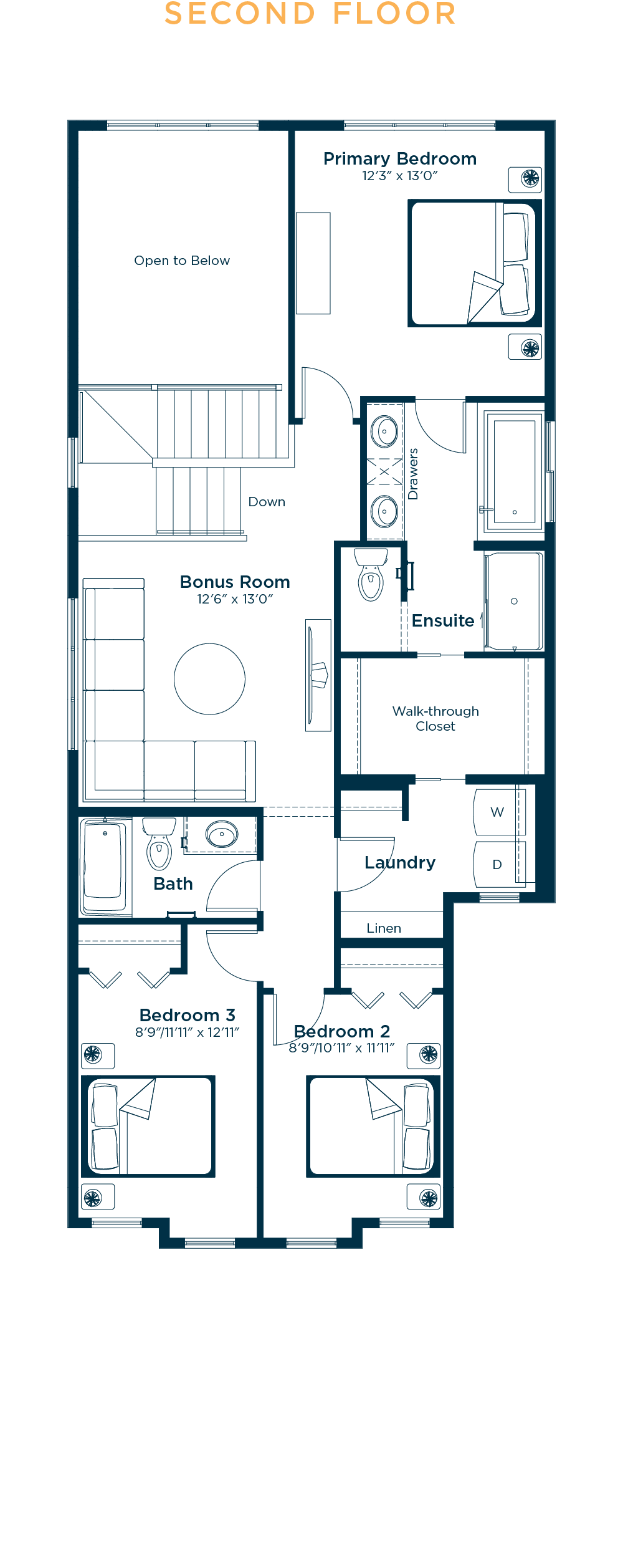 The Mason offers just over 2,000 square feet of pure elegance and functionality. You are welcomed by a main floor flex room and half bath off of the foyer. Continue through to the L-shaped kitchen that opens up to the dining nook and great room at the back of the house. Upstairs on the second floor, a cozy bonus room sits atop the stairs and separates the primary suite and laundry from the additional two bedrooms. Develop the basement to add additional living space or the perfect space for a game night with family and friends!