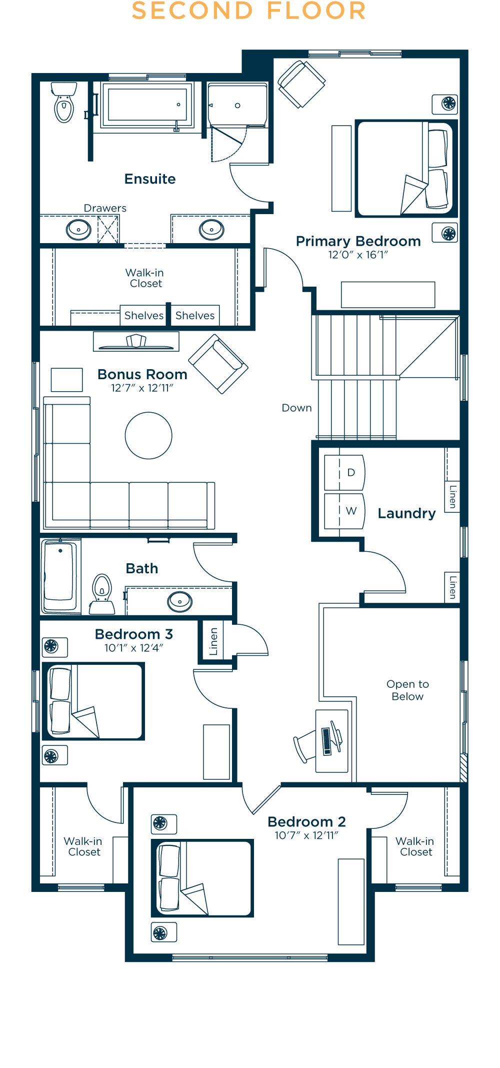 If you love to cook, the Seabrook is the perfect choice. With its central island, the impressive open-concept kitchen is truly the heart of this home. A convenient mudroom and front flex room, which can be used as an office or den, are great additions to the main floor. Upstairs, every bedroom features a walk-in closet, and the primary retreat includes a luxurious ensuite. A large laundry room and cozy multi-purpose bonus room complete the home.