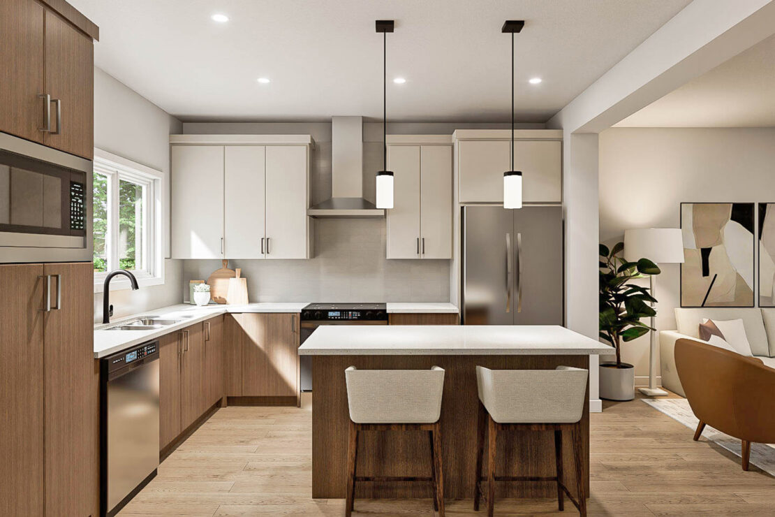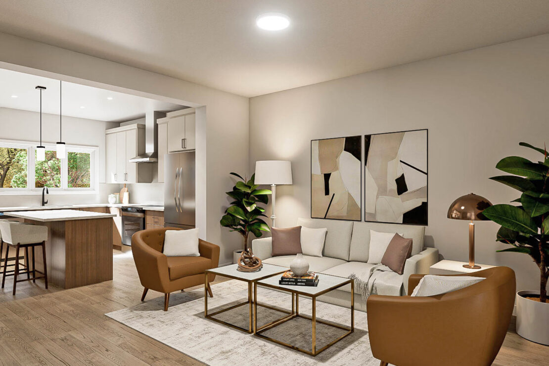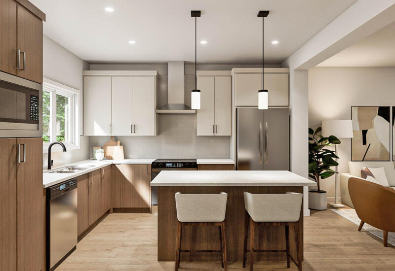 The Beckett is a thoughtfully designed duplex that blends style with functionality. At the front entry, two closets provide smart storage and easy organization. The central great room flows seamlessly into the L-shaped kitchen with a spacious island and dining nook at the rear of the home, perfect for family meals while keeping an eye on the kids at play. Upstairs, the grand primary suite features a large walk-in closet and private ensuite. Two additional bedrooms, a cozy bonus room ideal for movie nights, and the convenience of an upstairs laundry complete the second floor.