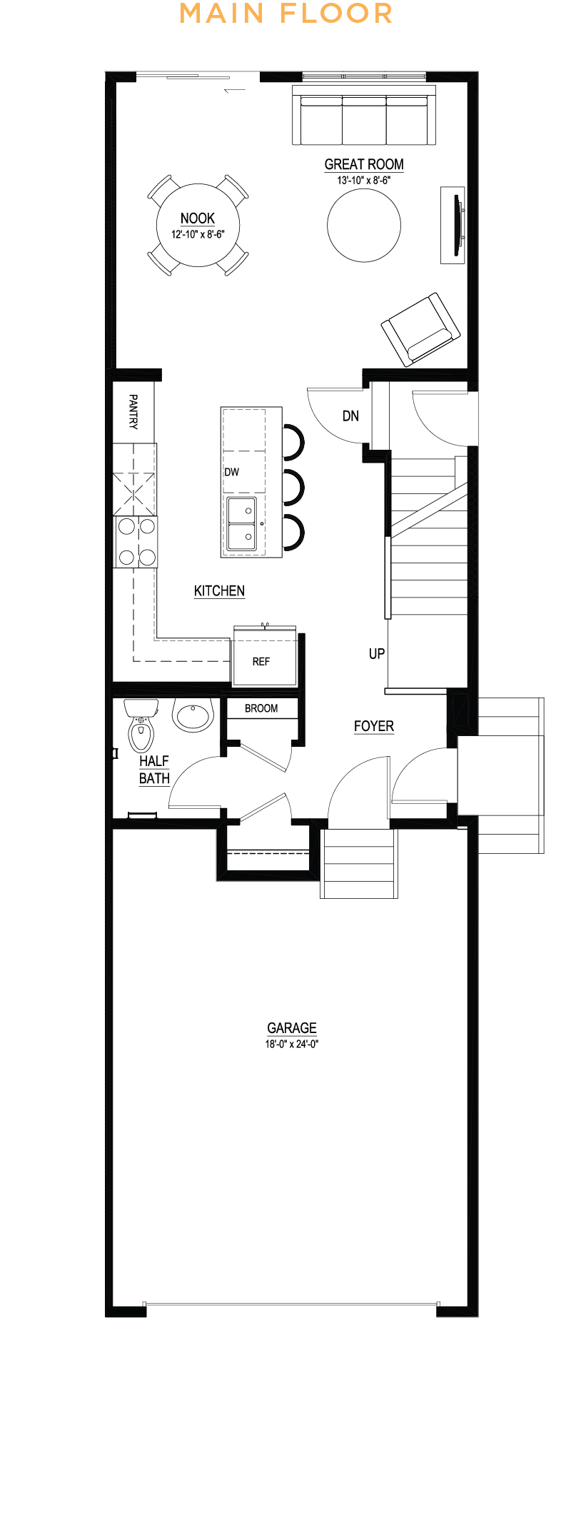 - Level 1 kitchen upgrade complete with crown moulding, island extension, 42” upper cabinets, and one pots and pans drawer