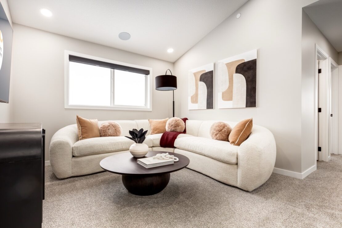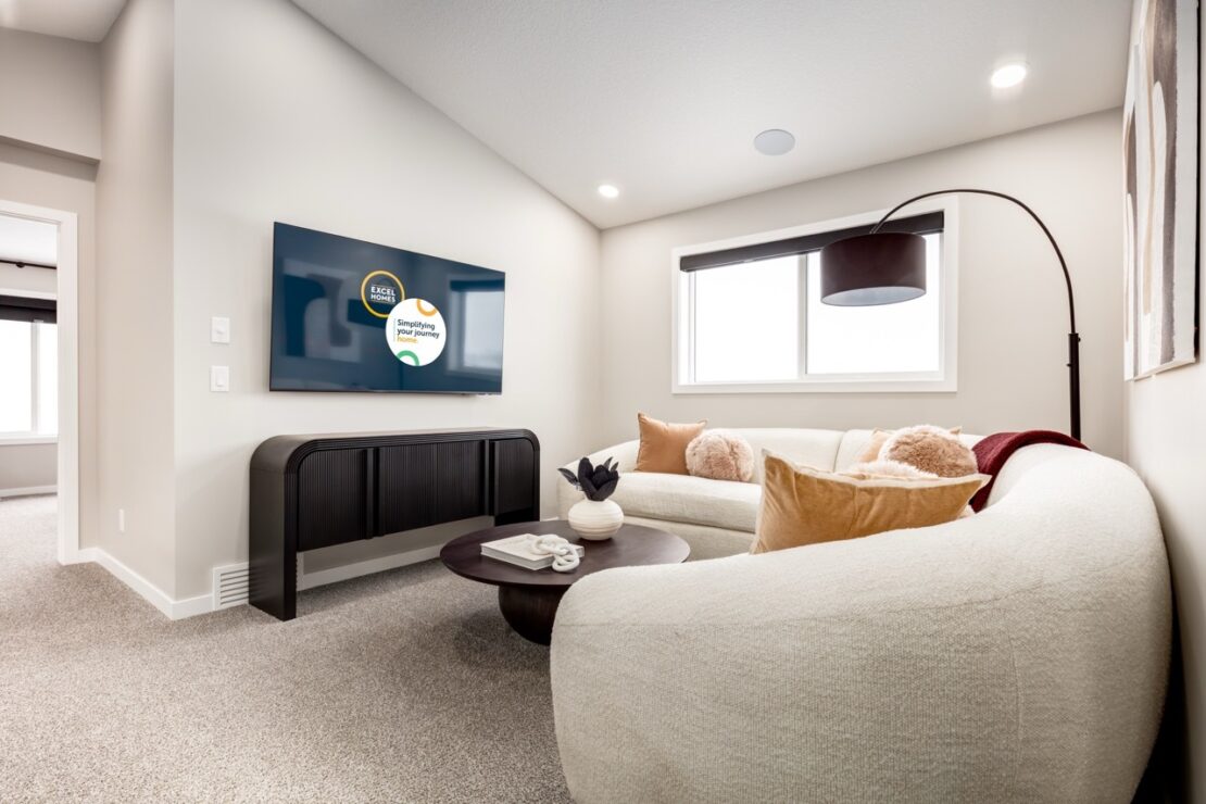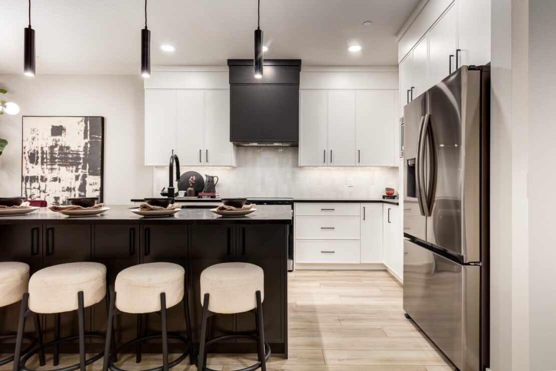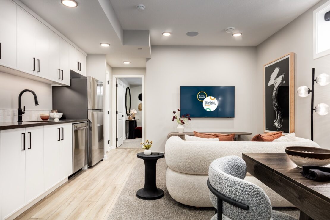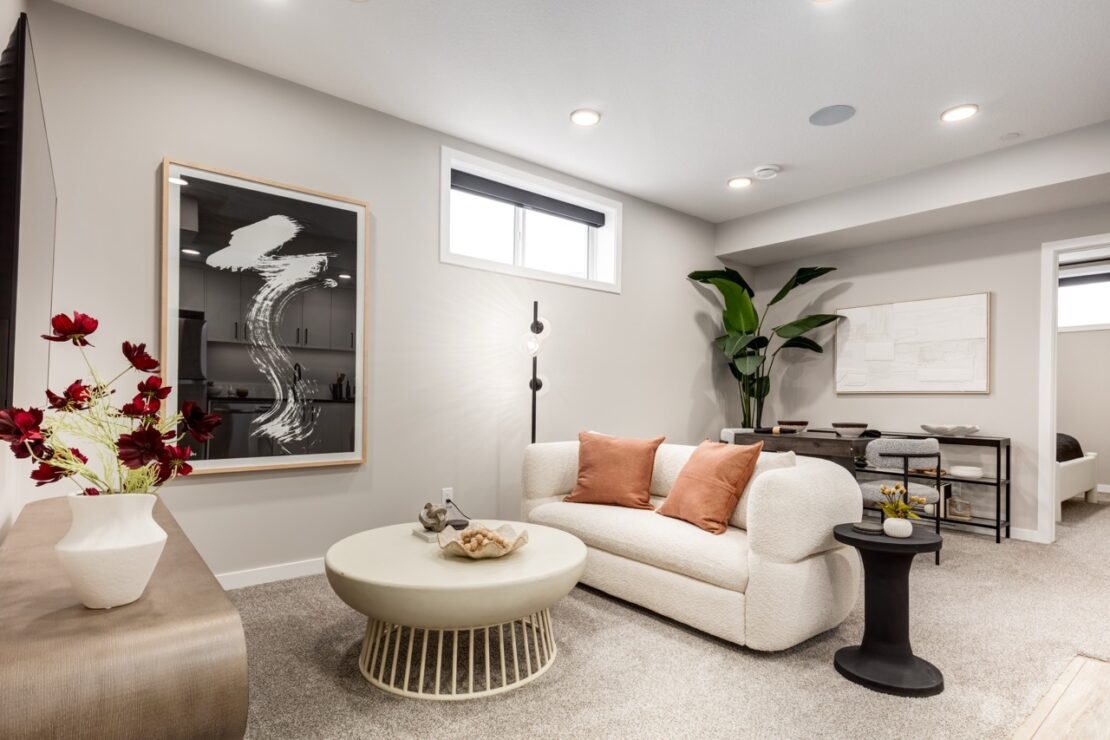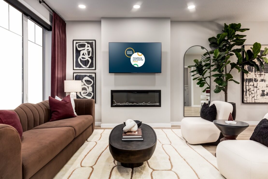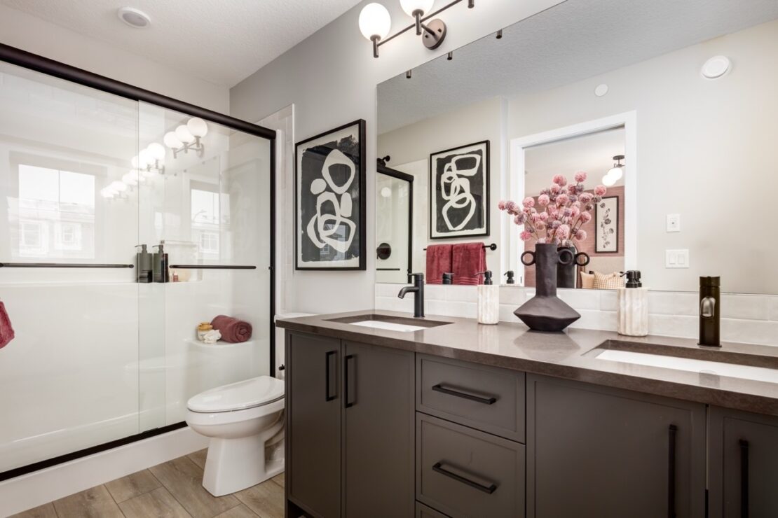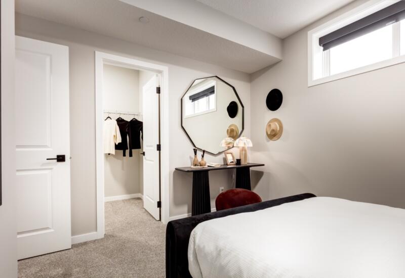 The Berkley show home features a bright, open‑concept layout that blends the kitchen, dining, and living areas with added potlights, a modern black linear chandelier, and a full‑height electric fireplace. The upgraded kitchen includes a spice kitchen, a one‑sided waterfall island, two‑toned cabinetry, an undermount Silgranit sink, and premium finishes like Artisan White backsplashes and Luxe Noir countertops. Natural light enhances the great room, while a flexible rear space benefits from a modern black flush mount and long‑run conduit for added functionality. Upstairs, a vaulted bonus room separates the two secondary bedrooms from the luxurious primary suite, which includes an upgraded shower, dual sinks, and Carbon countertops. A full bathroom, a conveniently located laundry room with upgraded appliances, and thoughtful finishes complete the upper floor. The fully developed basement adds even more versatility with a two‑bedroom layout, wet bar, added windows, its own laundry, and elevated features like Artisan White and Shadow cabinetry accents. Every detail—from the modern black lighting package to the black metal spindled railing and Designer Grey paint—brings a warm, elegant finish to this exceptional home.