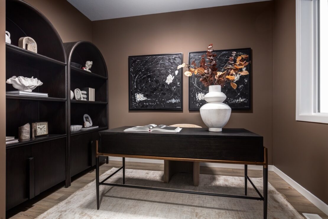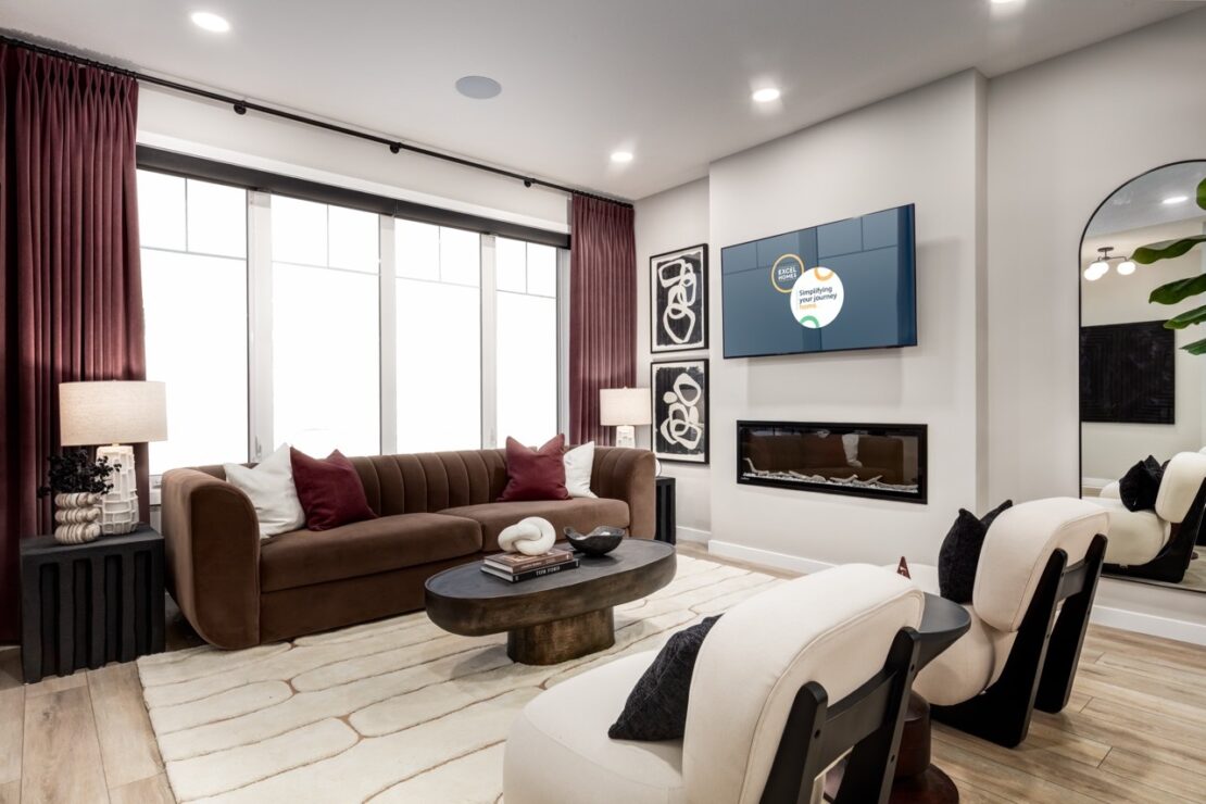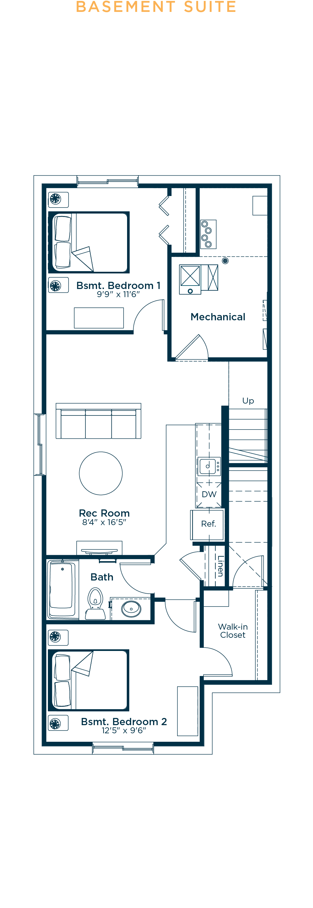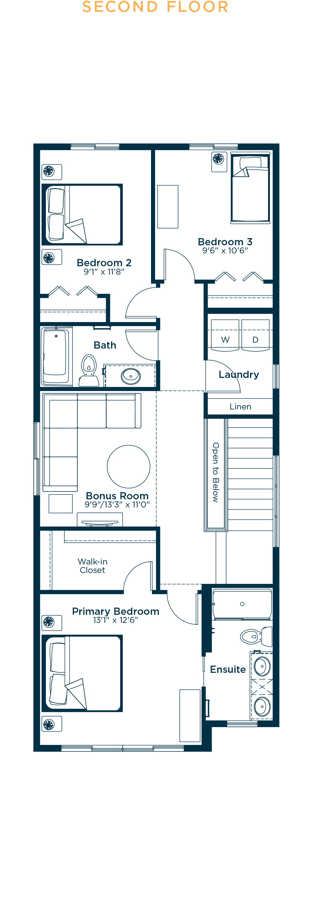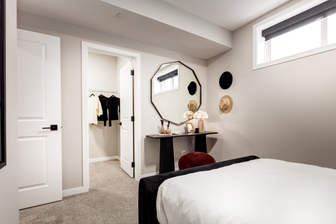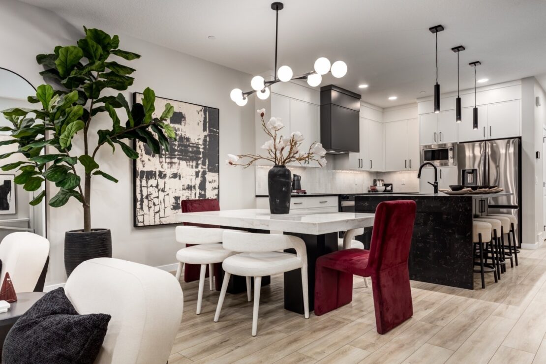The Berkley show home features a bright, open‑concept layout that blends the kitchen, dining, and living areas with added potlights, a modern black linear chandelier, and a full‑height electric fireplace. The upgraded kitchen includes a spice kitchen, a one‑sided waterfall island, two‑toned cabinetry, an undermount Silgranit sink, and premium finishes like Artisan White backsplashes and Luxe Noir countertops. Natural light enhances the great room, while a flexible rear space benefits from a modern black flush mount and long‑run conduit for added functionality. Upstairs, a vaulted bonus room separates the two secondary bedrooms from the luxurious primary suite, which includes an upgraded shower, dual sinks, and Carbon countertops. A full bathroom, a conveniently located laundry room with upgraded appliances, and thoughtful finishes complete the upper floor. The fully developed basement adds even more versatility with a two‑bedroom layout, wet bar, added windows, its own laundry, and elevated features like Artisan White and Shadow cabinetry accents. Every detail—from the modern black lighting package to the black metal spindled railing and Designer Grey paint—brings a warm, elegant finish to this exceptional home.