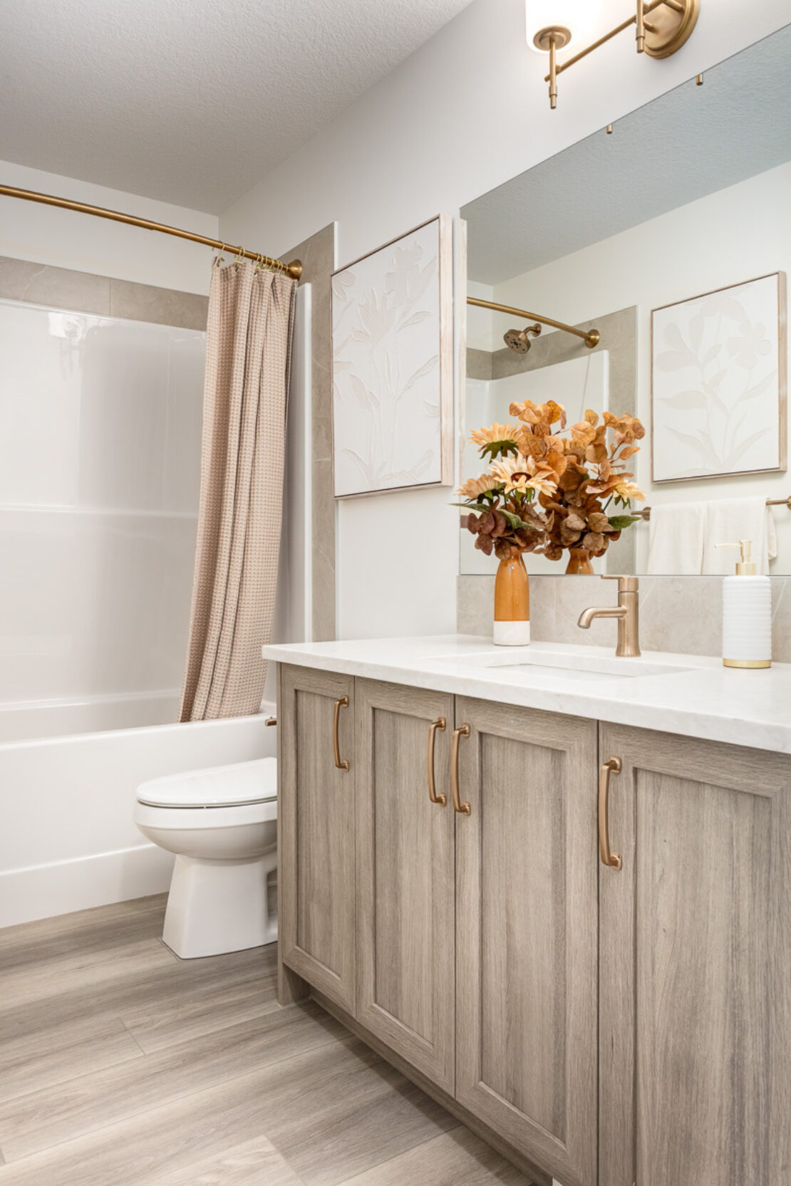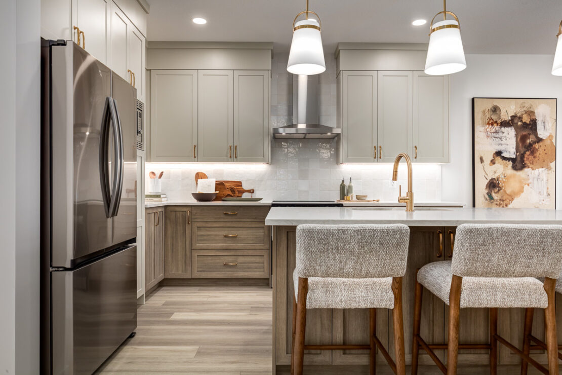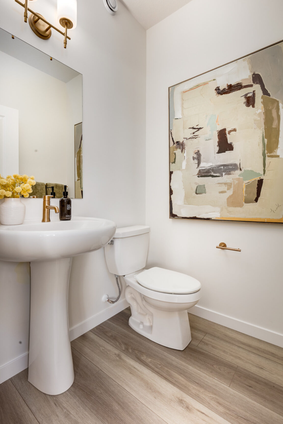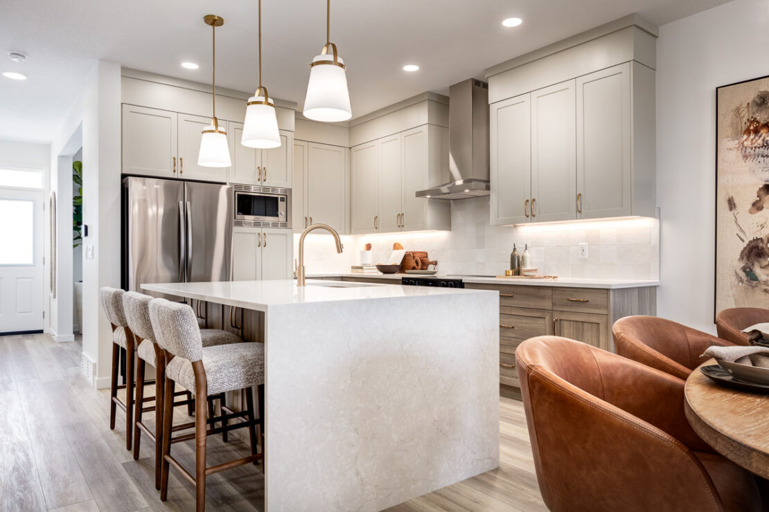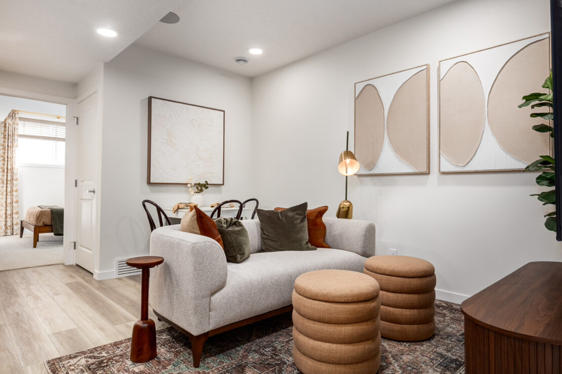 The Berkley show home offers a thoughtfully designed open-concept layout that seamlessly blends the kitchen, dining, and living areas. The gourmet kitchen impresses with its modern appliance package, two-toned cabinetry, an L-shaped counter with abundant storage, and a striking waterfall island with seating. Natural light floods the living area through large front-facing windows, while a bright, versatile flex room at the rear of the home provides space for work, play, or relaxation. Upstairs, a central bonus room separates the two secondary bedrooms from the luxurious primary suite, which features an upgraded ensuite with dual sinks and generous storage. A full bathroom and a conveniently located laundry room complete the upper floor. The fully developed basement offers its own kitchen, bathroom, laundry, and a flexible bonus space ideal for a home gym or office. Every detail has been carefully curated, from the white and gold lighting fixtures and champagne bronze plumbing accents to the h-cut wood spindled railing, bringing both elegance and warmth to this exceptional home.
