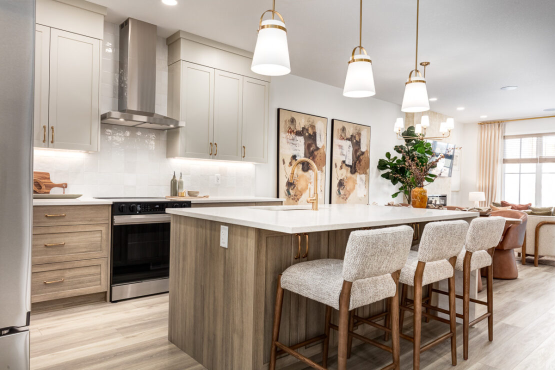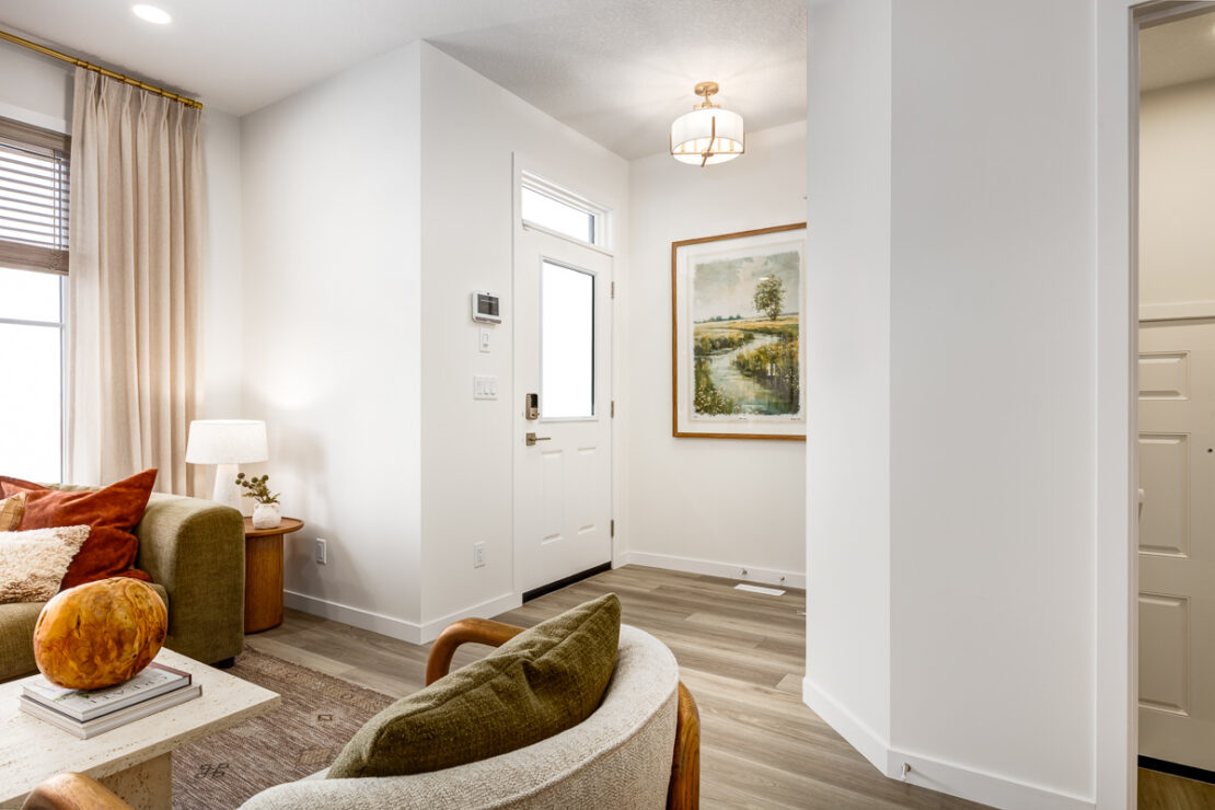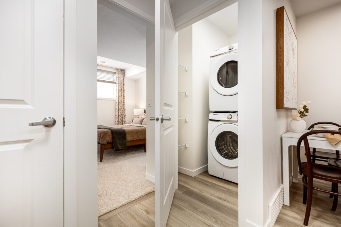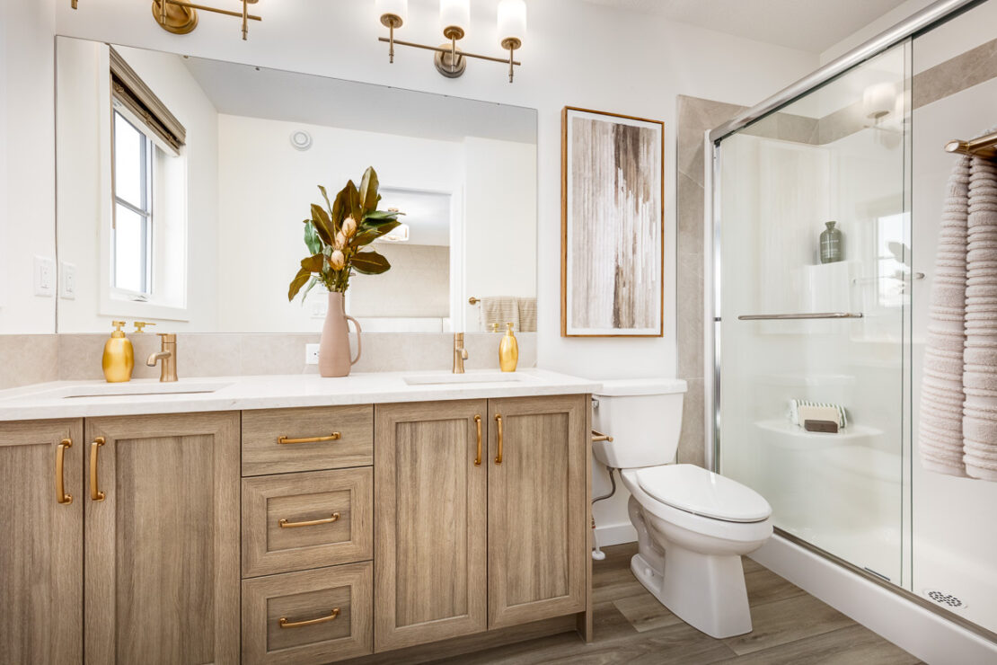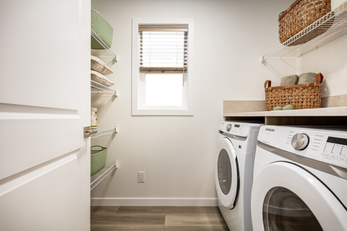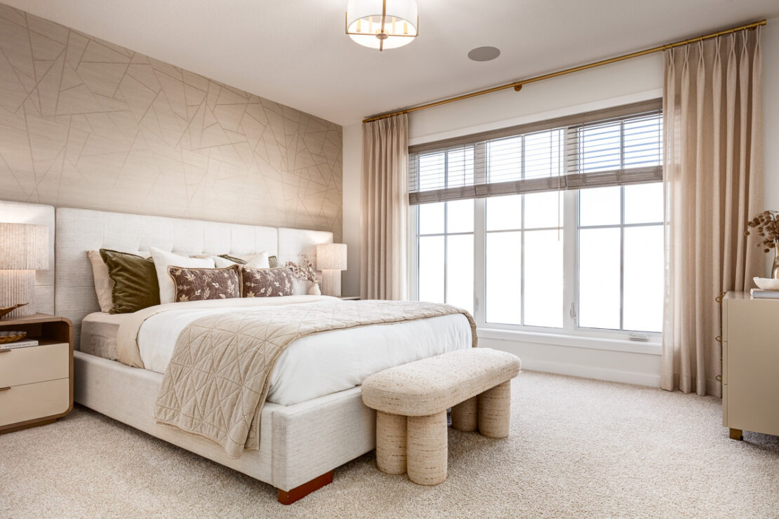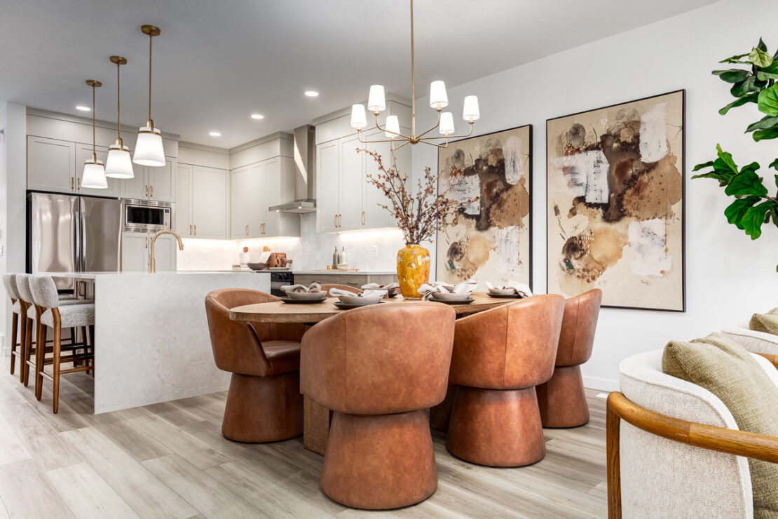 The Berkley show home offers a thoughtfully designed open-concept layout that seamlessly blends the kitchen, dining, and living areas. The gourmet kitchen impresses with its modern appliance package, two-toned cabinetry, an L-shaped counter with abundant storage, and a striking waterfall island with seating. Natural light floods the living area through large front-facing windows, while a bright, versatile flex room at the rear of the home provides space for work, play, or relaxation. Upstairs, a central bonus room separates the two secondary bedrooms from the luxurious primary suite, which features an upgraded ensuite with dual sinks and generous storage. A full bathroom and a conveniently located laundry room complete the upper floor. The fully developed basement offers its own kitchen, bathroom, laundry, and a flexible bonus space ideal for a home gym or office. Every detail has been carefully curated, from the white and gold lighting fixtures and champagne bronze plumbing accents to the h-cut wood spindled railing, bringing both elegance and warmth to this exceptional home.
