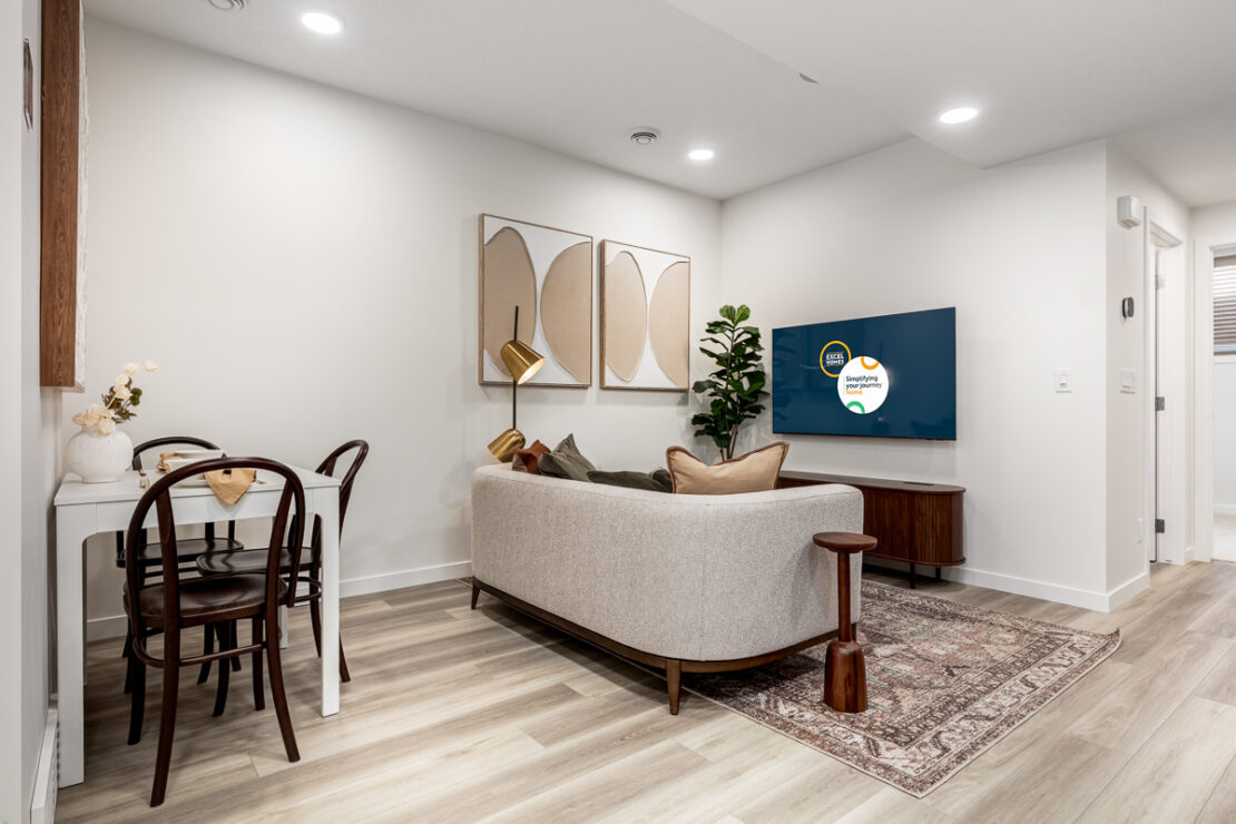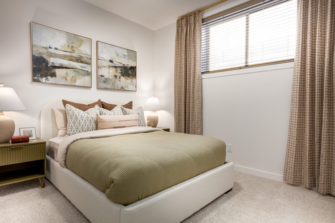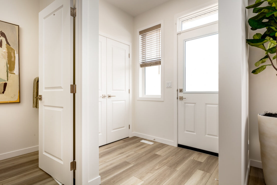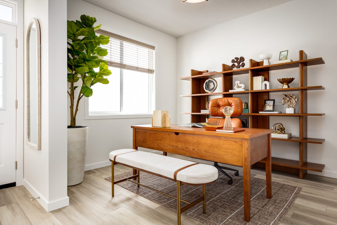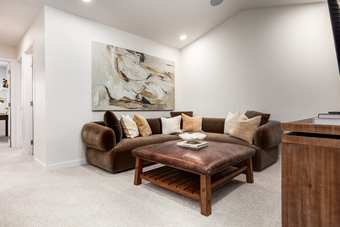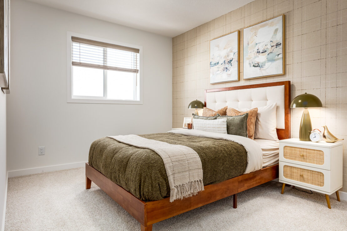 The Berkley show home offers a thoughtfully designed open-concept layout that seamlessly blends the kitchen, dining, and living areas. The gourmet kitchen impresses with its modern appliance package, two-toned cabinetry, an L-shaped counter with abundant storage, and a striking waterfall island with seating. Natural light floods the living area through large front-facing windows, while a bright, versatile flex room at the rear of the home provides space for work, play, or relaxation. Upstairs, a central bonus room separates the two secondary bedrooms from the luxurious primary suite, which features an upgraded ensuite with dual sinks and generous storage. A full bathroom and a conveniently located laundry room complete the upper floor. The fully developed basement offers its own kitchen, bathroom, laundry, and a flexible bonus space ideal for a home gym or office. Every detail has been carefully curated, from the white and gold lighting fixtures and champagne bronze plumbing accents to the h-cut wood spindled railing, bringing both elegance and warmth to this exceptional home.